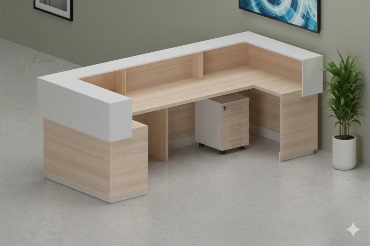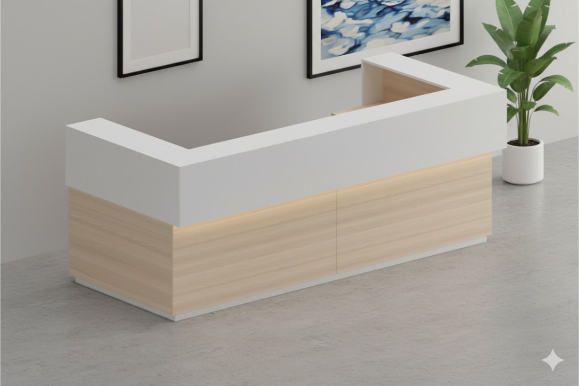 Upgrade your office entrance with this Modern L-Shaped Reception Desk, crafted with a premium white countertop and natural light wood base for a professional yet welcoming appearance. Perfectly suited for reception areas, corporate offices, clinics, and showrooms in Dubai and across the UAE, this reception desk combines functionality with style. The spacious design allows comfortable workspace management, while the clean lines and LED accent lighting create a contemporary look. Built with durable MDF and finished with high-quality lamination, this desk ensures long-lasting use and easy maintenance. A perfect choice for businesses looking to impress clients with a modern, minimalist reception area.