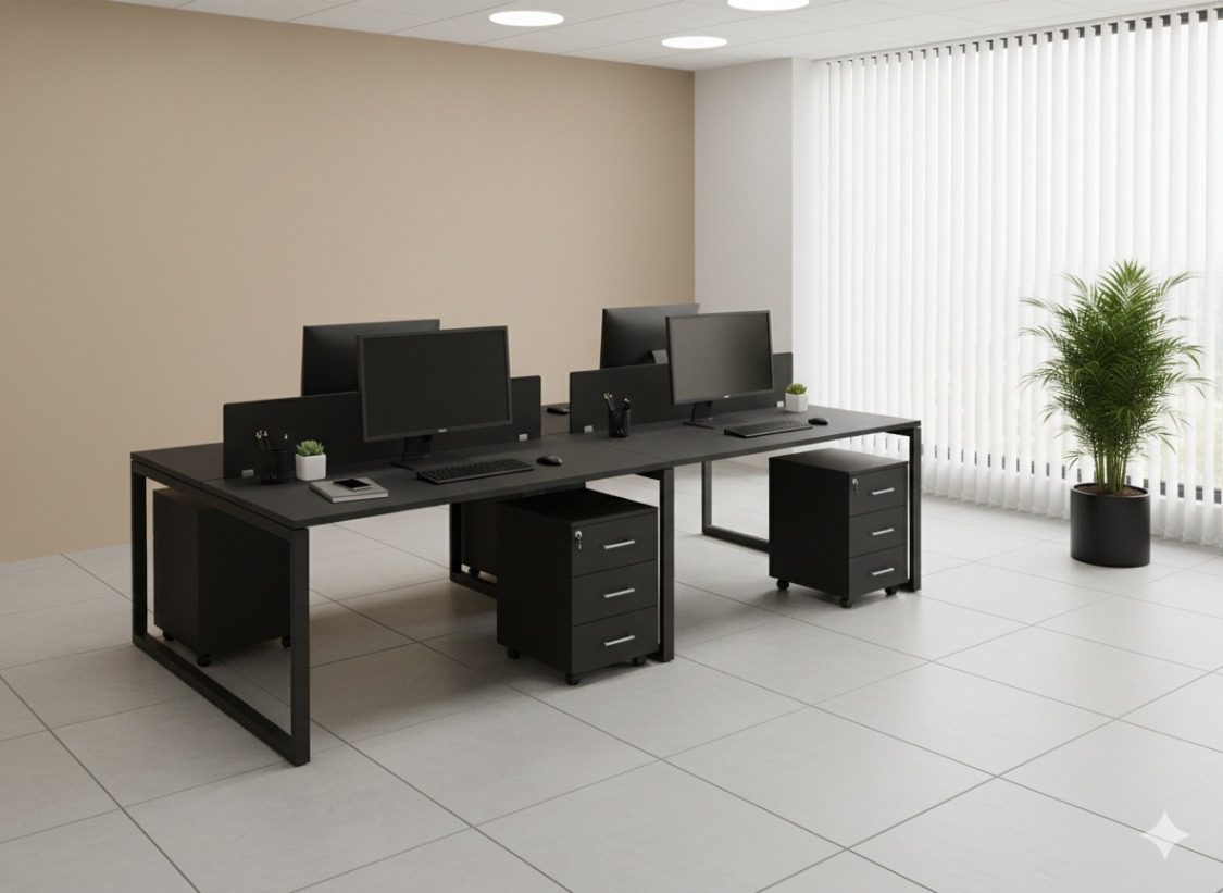A sleek and modern 4-seater black modular workstation desk, designed for collaborative workspaces. Comes with privacy panels and individual drawer units for efficient storage and organization.