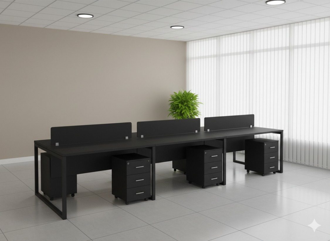 A spacious and durable 6-seater modular workstation desk in matte black finish, complete with privacy dividers and individual drawer units — perfect for team collaboration in modern offices.