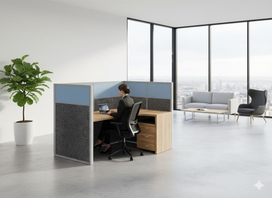Its sleek combination of wood finish desk and soft fabric partitions creates a balance between privacy and openness, making it suitable for both corporate offices and coworking spaces.