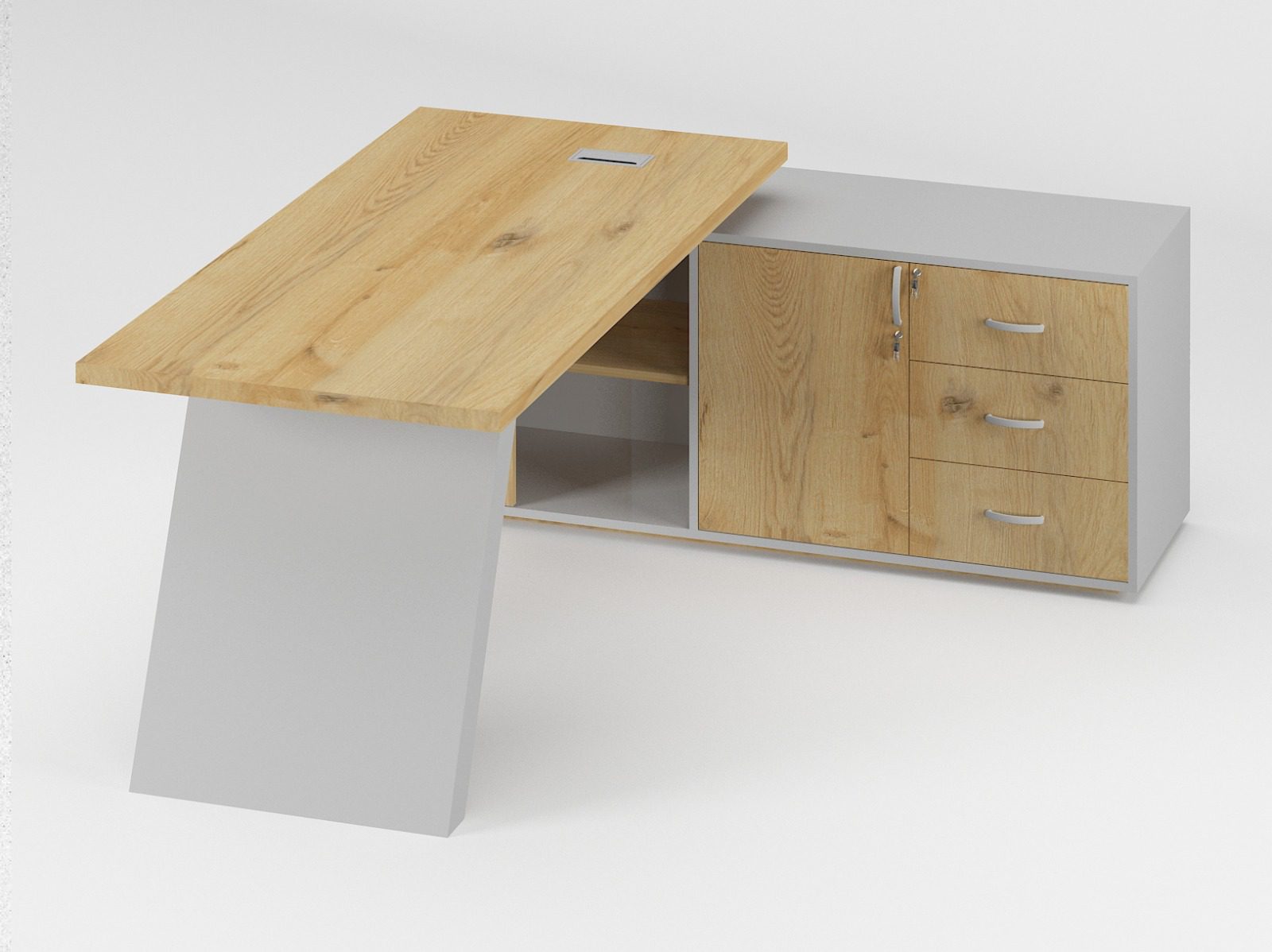 Built-in side storage featuring three drawers and a lockable cabinet for organized storage of files and office essentials