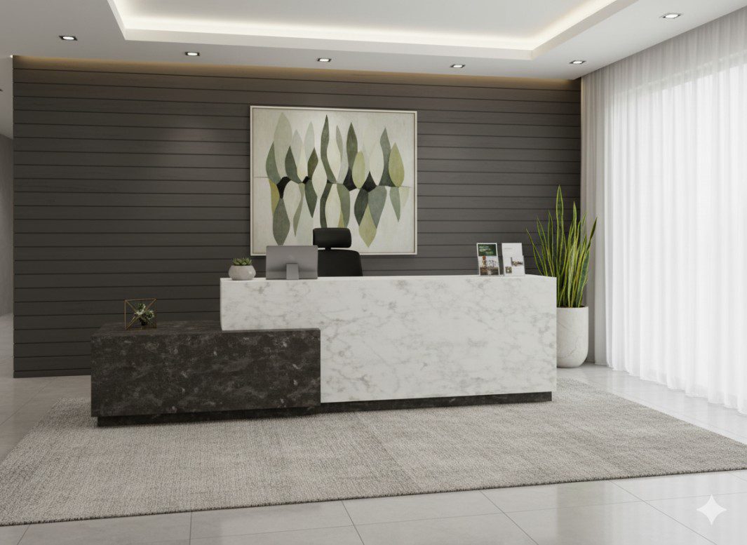 The Churchill Large Reception Desk is the perfect choice for businesses in Dubai, Abu Dhabi UAE looking to enhance their reception area with style and functionality. Featuring a dual-tone marble finish, this desk adds a touch of luxury while offering a spacious and practical layout for reception tasks and visitor management. Its elegant white and dark stone contrast complements modern office interiors, making it ideal for corporate offices, hotels, clinics, and showrooms across Dubai and the UAE. Built with durability and design in mind, the Churchill Reception Desk is more than just furniture – it’s a statement that reflects professionalism and sophistication.