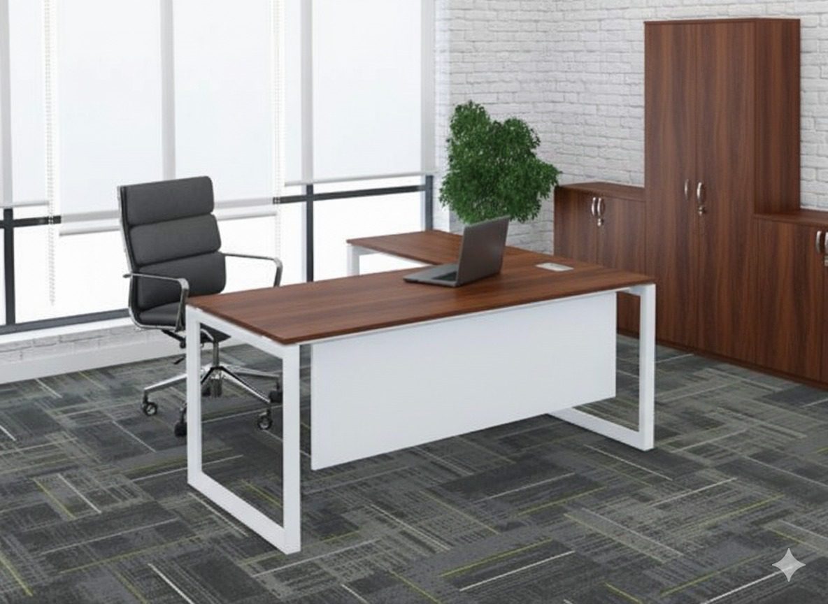 Modern and stylish l shaped executive desk with storage cabinet best for a managerial or boss cabin at the best price in online Dubai, UAE.