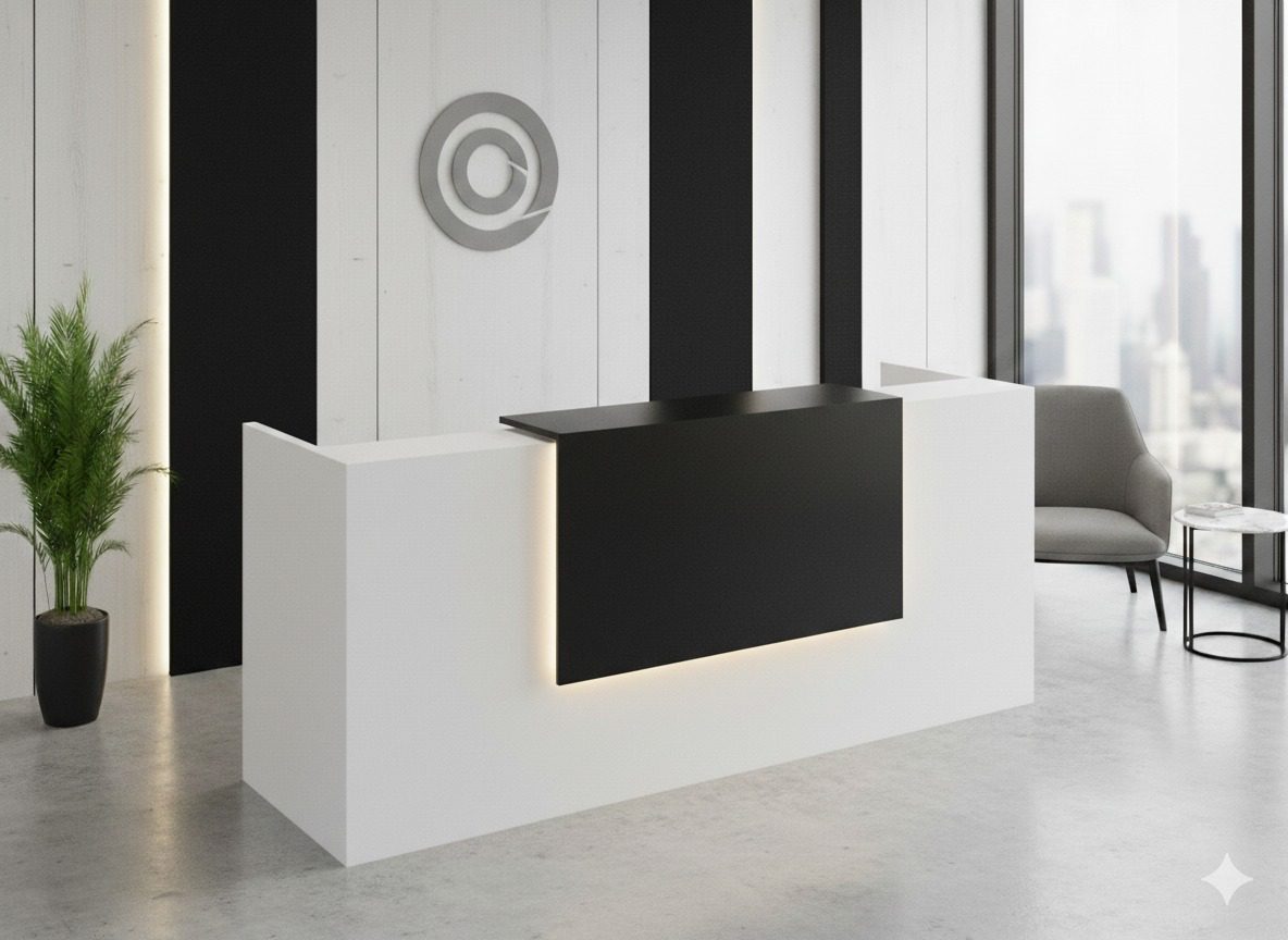 Upgrade your office entrance with the Elite Black and White Reception Desk, available across the UAE – Dubai, Abu Dhabi, Sharjah, Ajman, Fujairah, Ras Al Khaimah, and Umm Al Quwain. This striking two-tone counter combines the bold elegance of black with the sleek sophistication of white, making it a standout centerpiece for any reception area.