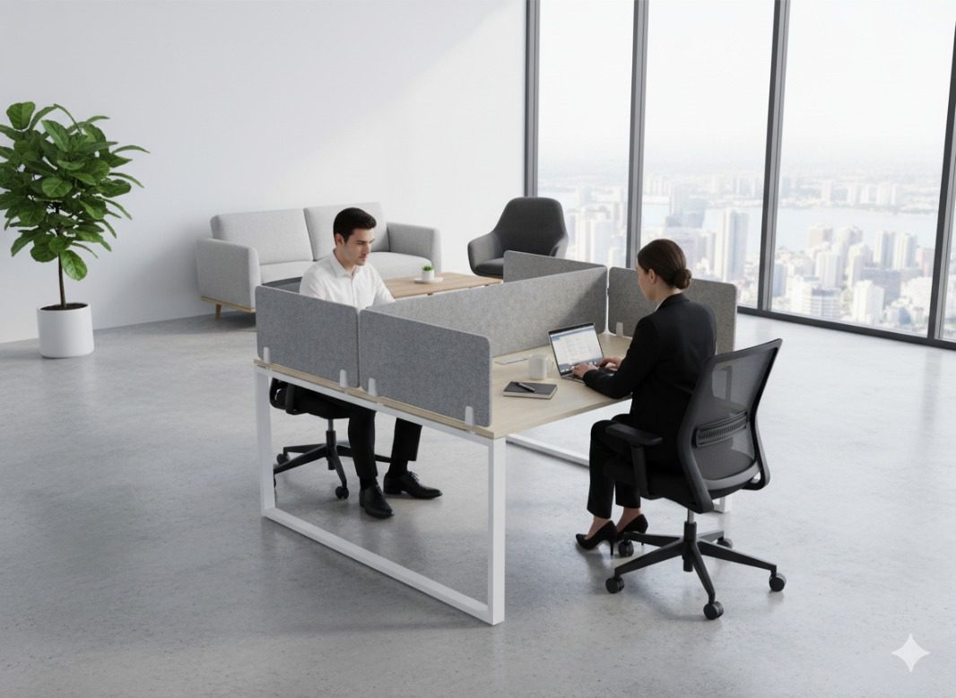 It is possible to configure the most diversified workstations by means of sound absorbent panels that are placed into a special housing in the table, which is also fitted with a cable hole and a cable tray.